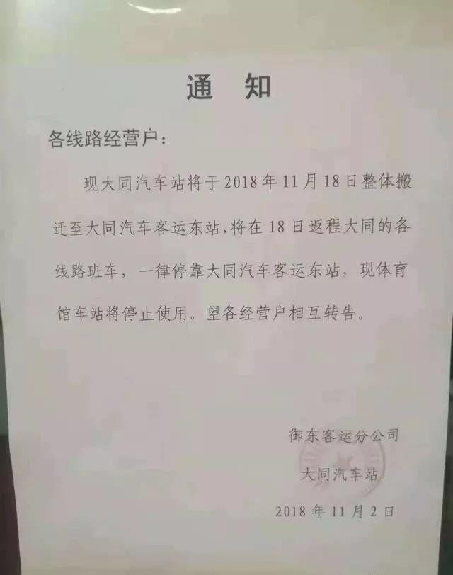 现大同汽车站将于 2018 年 11 月 18 日整体搬迁至大同汽车客运东站,将在 18 日返程大同的各线路班车,一律停靠大同汽车客运东站,现体育馆车站将停止使用。