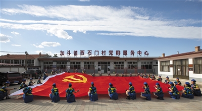 6月17日,广灵县加斗镇56位巧手绣娘举起她们亲手缝制的100平方米巨大党旗,向党的百年华诞献礼。